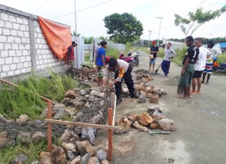 JAYAPURA (PT) - Kepolisian Sektor Sentani Kota dalam hal ini Bhabinkamtibmas Polsek Sentani Kota, Bripka. Surianto bersama warga binaannya membangun Pos Kamling di Perumahan BTN Bintang Timur Sentani, Selasa (12/6/2018).