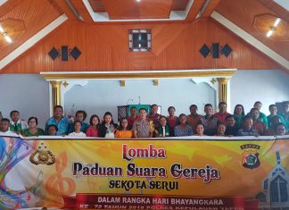 JAYAPURA (PT) - Polres Kepulauan Yapen dalam memperingati HUT Bhayangkara ke 72 yang jatuh pada tanggal 1 Juli 2018 mengadakan lomba lagu Rohani di Gereja Sekota Serui, Minggu(10/6/18).