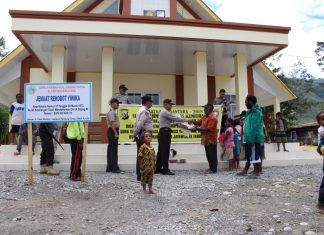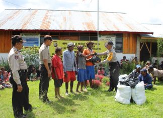 JAYAPURA (PT) - Polres Jayawijaya melalui Satuan Binmas menyerahkan bantuan kepada Gereja Kemah Injil (Kingmi) Papua Klasis Baliem Utara, Jemaat Rehobot Yiwika di Kampung Yiwika, Distrik Kurulu, Kamis (7/6/2018).