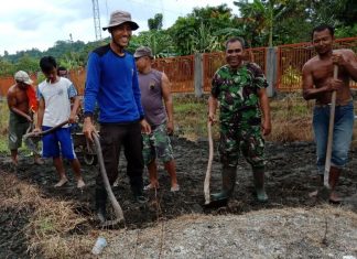 JAYAPURA (PT) - Aparat Bhabinkamtibmas Kampung Khemon Jaya, Bripda. Fajar Yuliyanto bersama Babinsa dan masyarakat melaksanakan kerja bakti menimbun halaman Balai Kampung Khemon Jaya, SP V, Sabtu (26/5/2018).