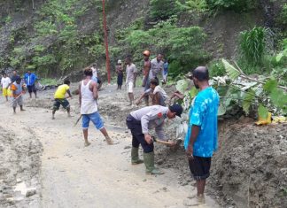 JAYAPURA (PT) – Polsek Depapre bersama Koramil Depapre dan warga membersihkan tumpahan material longsoran tanah dan batu yang terjadi diruas jalan Depapre tepatnya di tanjakan gunung Depapre, Jumat (4/1).