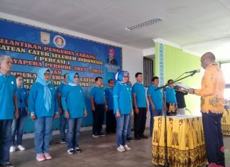 JAYAPURA (PT) - Ketua KONI Kota Jayapura yang juga Wali Kota Jayapura, DR. Benhur Tomi Mano, MM resmi melantik Ketua Persatuan Catur Seluruh Indonesia (Percasi) yang di ketuai Merlan Uloli di Aula SMPN 1 Jayapura, Sabtu (5/5/2018).