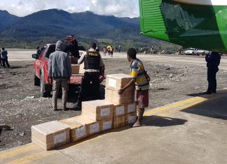 JAYAPURA (PT) - Kepala Kepolisian Resor Puncak Jaya AKBP Ary Purwanto, SIK melalui Kapolsek Ilaga Iptu Menase Sayori bersama para personelnya mengawal kedatangan logistik pemilu tahun 2019 di Bandara Aminggaru, Distrik Ilaga Kabupaten Puncak, Sabtu (16/2).