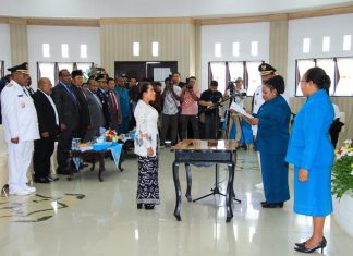 WAMENA (PT) - Ketua TP PKK Provinsi Papua, Ny. Yulce Enembe, SH resmi melantik Ketua TP PKK Jayawijaya, Ny. Yustina Yenni Banua, Selasa (18/12/2018) di Aula Wio Kantor Bupati Jayawijaya.