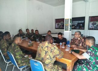 JAYAPURA (PT) - Satgas Yonif Para Raider 501/Kostrad menerima kunjungan dari Bravo Company Commander PNGDF, Major Adolf Kaien beserta Konsulat Jenderal RI-PNG, Abraham Franky Izaak di Pos...